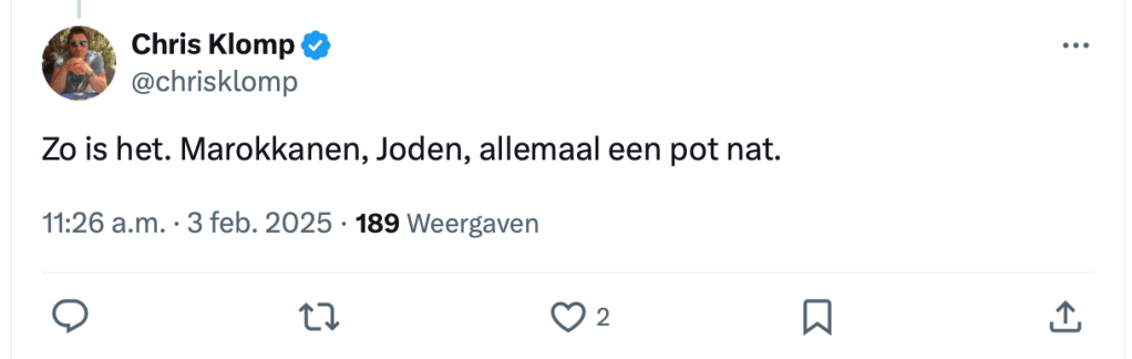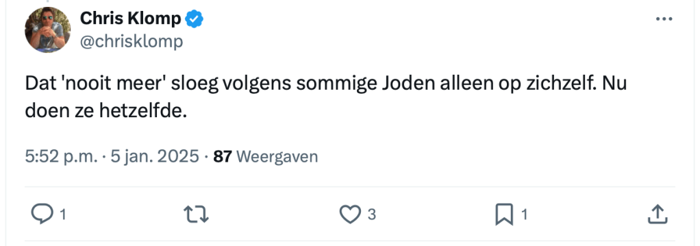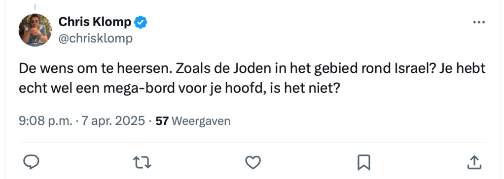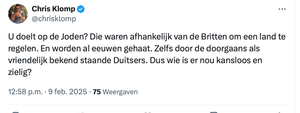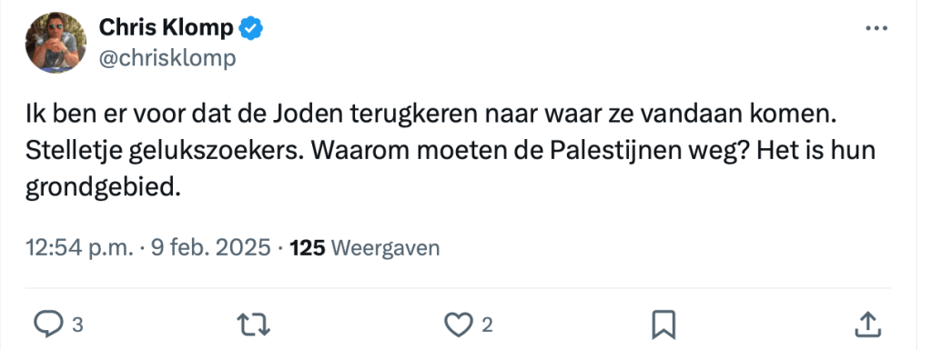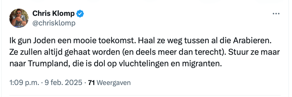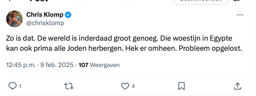 Waarom hij dat schreef? Omdat iemand op X vroeg: “Als ik nu eens over die rode lijn heen kijk, zie ik dan een (suggestie voor) een definitieve oplossing?” Klomps antwoord: deportatie. Geen grap, geen uitleg. Gewoon een keiharde uitspraak.