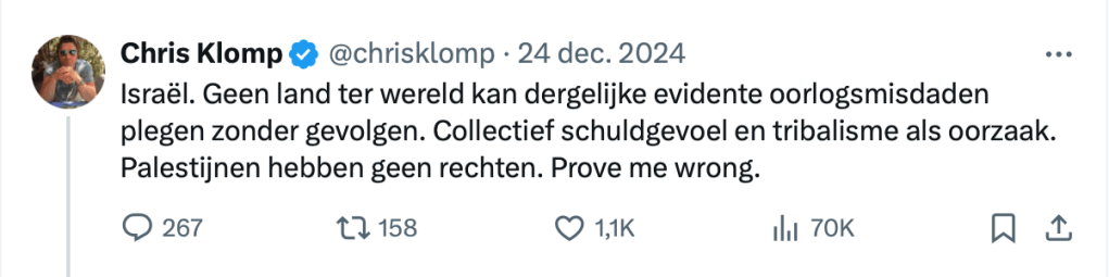Maar laten we helder zijn: wat Klomp schreef, is walgelijk. Niet omdat het over Joden ging. Niet omdat het over Palestijnen zou kunnen gaan. Maar omdat het over mensen gaat. Het deporteren van een bevolkingsgroep suggereren is geen spiegel. Het is moreel failliet, ongeacht het doelwit.