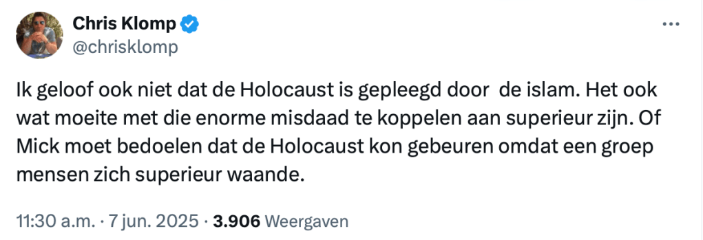 Volgens Klomp is zijn uitspraak dus “een spiegel” en wie daar boos op wordt, bevestigt volgens hem alleen maar zijn gelijk. Een klassiek rookgordijn: hij trekt de morele jas nog strakker aan, zonder iets terug te nemen. Wie kritiek heeft, is ineens schuldig aan stilzwijgen over ander onrecht.